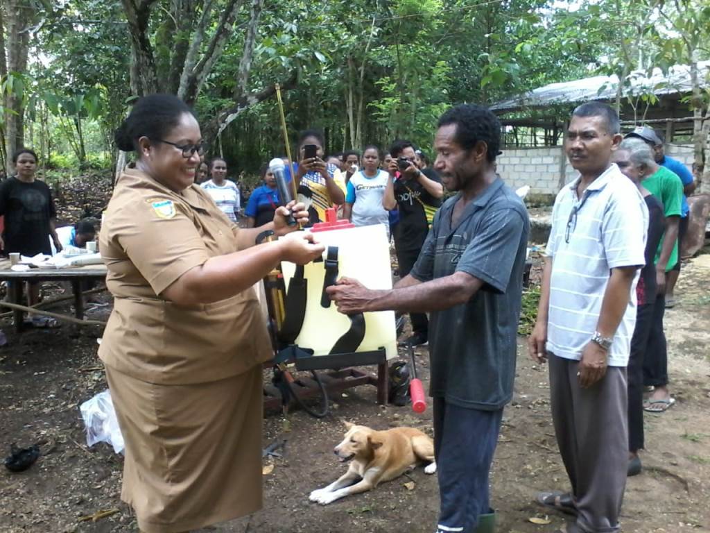 Pimpinan SPNF-SKB Biak Margaretha Singgamui, S.Pd,saat menyerahan batuan kepada kelompok yang mengikuti pelatihan perkebunan