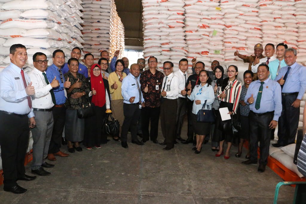 Pimpinan dan anggota DPRD kota Jayapura pose ,bersama kepala Perum Bulog Divisi Regional Papua dan Papua Barat,Sopran Kenedi di Gudang Bulog