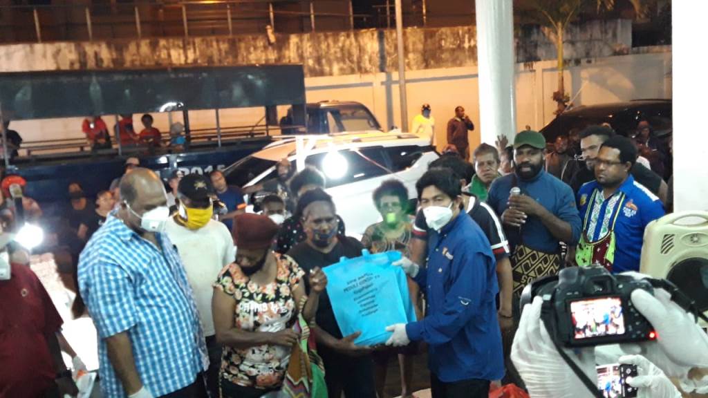 Saat menyerahkan bantuan kepada istri almarhum Hery Bertus yang meninggal pada Kamis (16/4/2020), di samping Aqua lala, Kepala Distrik Jayapura Selatan Jaya Kusuma harap  masyarakat jangan menjustifikasi keluarga yang belum tentu terivenksi covid – 19.