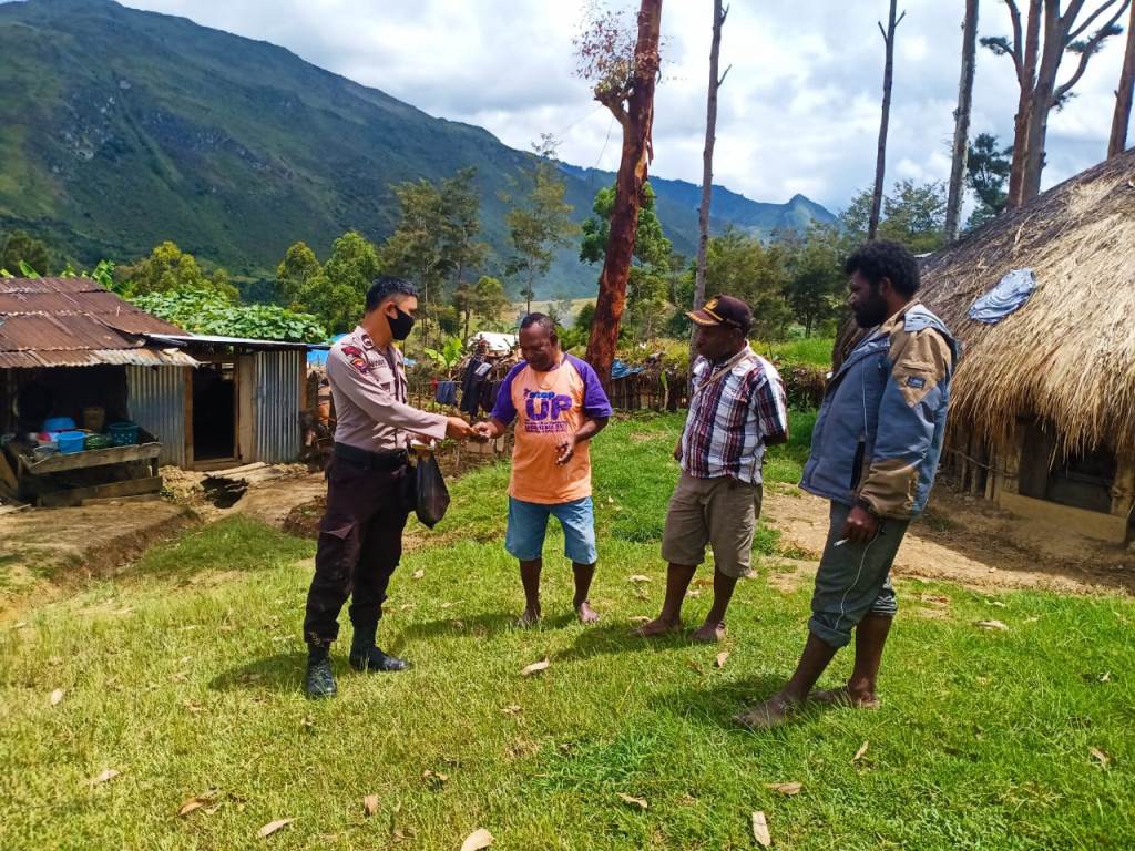 Dalam kesempatan tersebut ,Bripda Budi menyampaikan himbauan kepada bapak Frans Kogoya agar selalu menggunakan masker ketika melakukan aktivitas di luar rumah.