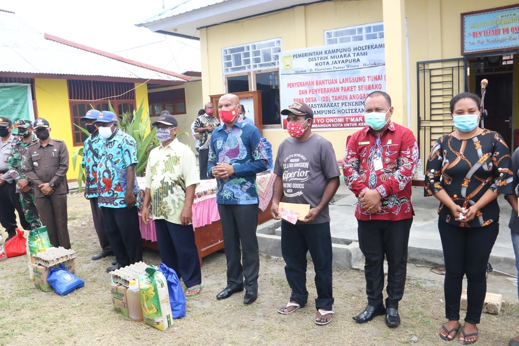 Jayapura,Teraspapua.com – Wali Kota Jayapura,Dr.Benhur Tomi Mano,MM menyerahkan Bantuan Langsung Tunai (BLT) dan penyerahan paket sembako Dana Desa (DD) tahun anggaran 2020 kepada masyarakat penerimah manfaat di kampung Holtekamp Distrik Muara Tami,Selasa (2/6/2020).