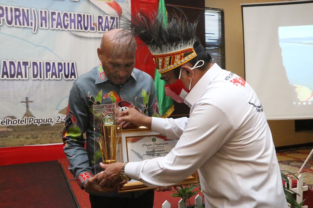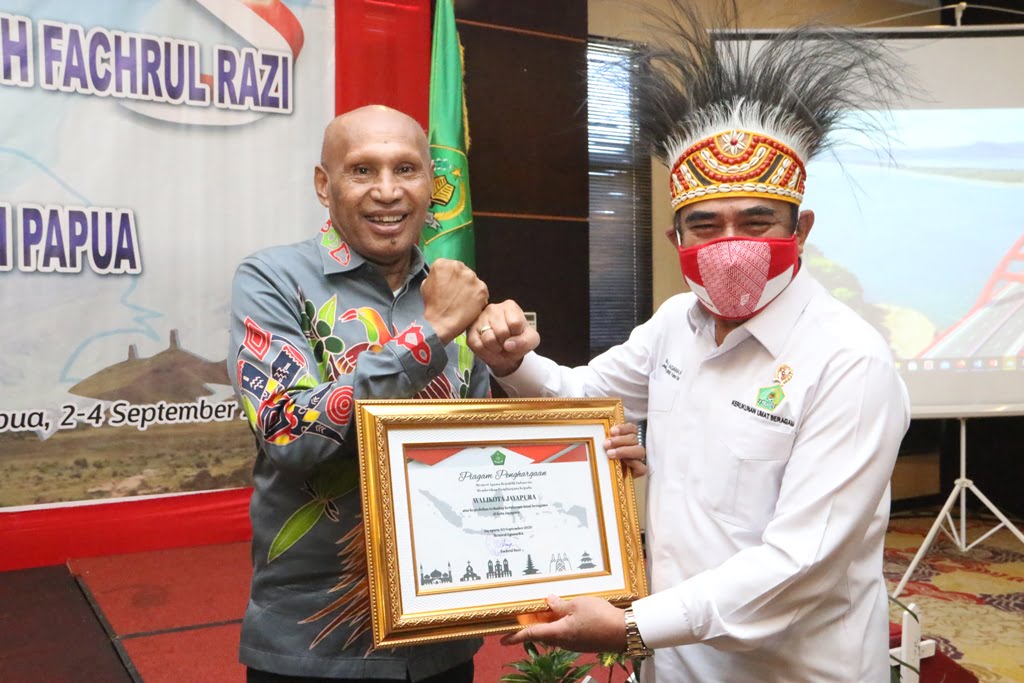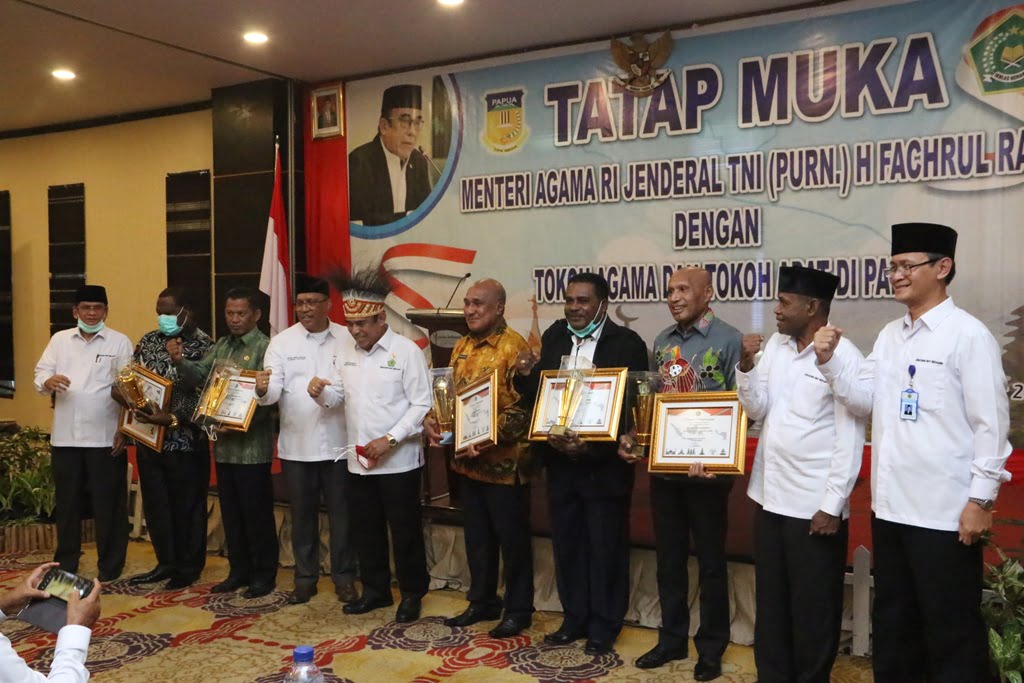 Penghargaan itu diberikan langsung oleh Menteri Agama, Jenderal TNI ( Pur ) , H Fachrul Razi saat menggelar tatap muka dengan tokoh agama dan tokoh adat Papua dan launching program Aku Cinta Papua di Swiss Belhotel kota Jayapura, Kamis (3/9/2020).