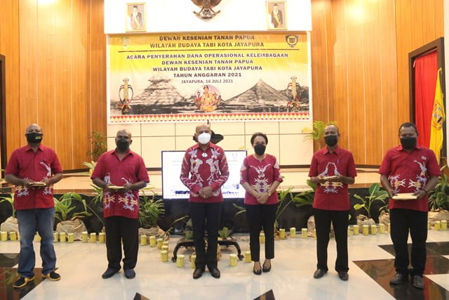 Wali Kota Benhur Tomi Mano yang juga Ketua Umum Dewan Kesenian Papua wilayah Tabi menyerahkan dana tersebut yang diawali dengan penandatanganan berita acara.