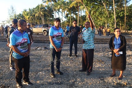 Tenaga Ahli Menteri Sosial, Benhur Tomi Mano saat meninjau lokasi pembukaan Sidang Sinode di pantai Kampung Sarafamba, Distrik, Waropen yang masih dalam pengerjaan.