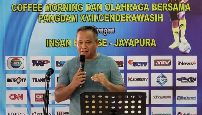 Jayapura,Teraspapua.com – MPangdam XVII/Cenderawasih Mayjen TNI Muhammad Saleh Mustafa melaksanakan Coffee Morning dan olahraga bersama dengan Insan Pers Se-Jayapura dan mantan pemain sepak bola Persipura, berlangsung di Stadion Mandala, Kota Jayapura, Papua. Jumat (25/11/2022).
