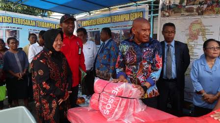 Mensos Risma juga menyerahkan bantuan di Posko Peduli Bencana Gempa Bumi di Kantor Klasi GKI Port Numbay. Gempa bumi yang mengguncang Kota Jayapura, sejak awal Januari lalu, mendapat perhatian serius dari Kementerian Sosial RI.