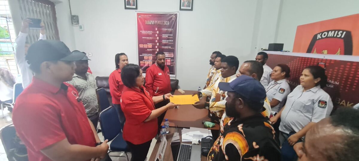 Dipimpin Ketua DPC PDI Perjuangan Kabupaten Puncak, Simon Hoborsi SH, dan di dampingi Sekretaris Mega MF Nikijuluw SH,MH. Serta kandidat Bacaleg partai  banteng moncong putih itu, menyerahkan dokumen para Bacaleg kepada ketua KPU setempat Yopi Wonda di dampingi 4 anggotanya.