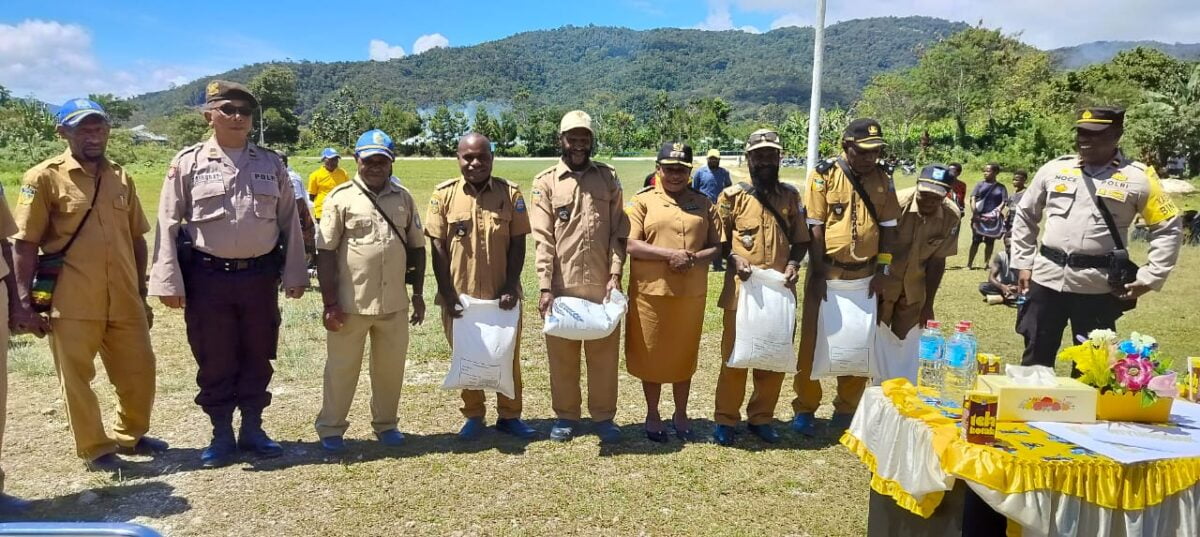 Masyarakat dari lima belas distrik antusias menerima bantuan beras yang disaksikan aparat keamanan dari Polres Mamberamo Tengah, dan Ketua LMA Distrik Bogol Mabel.