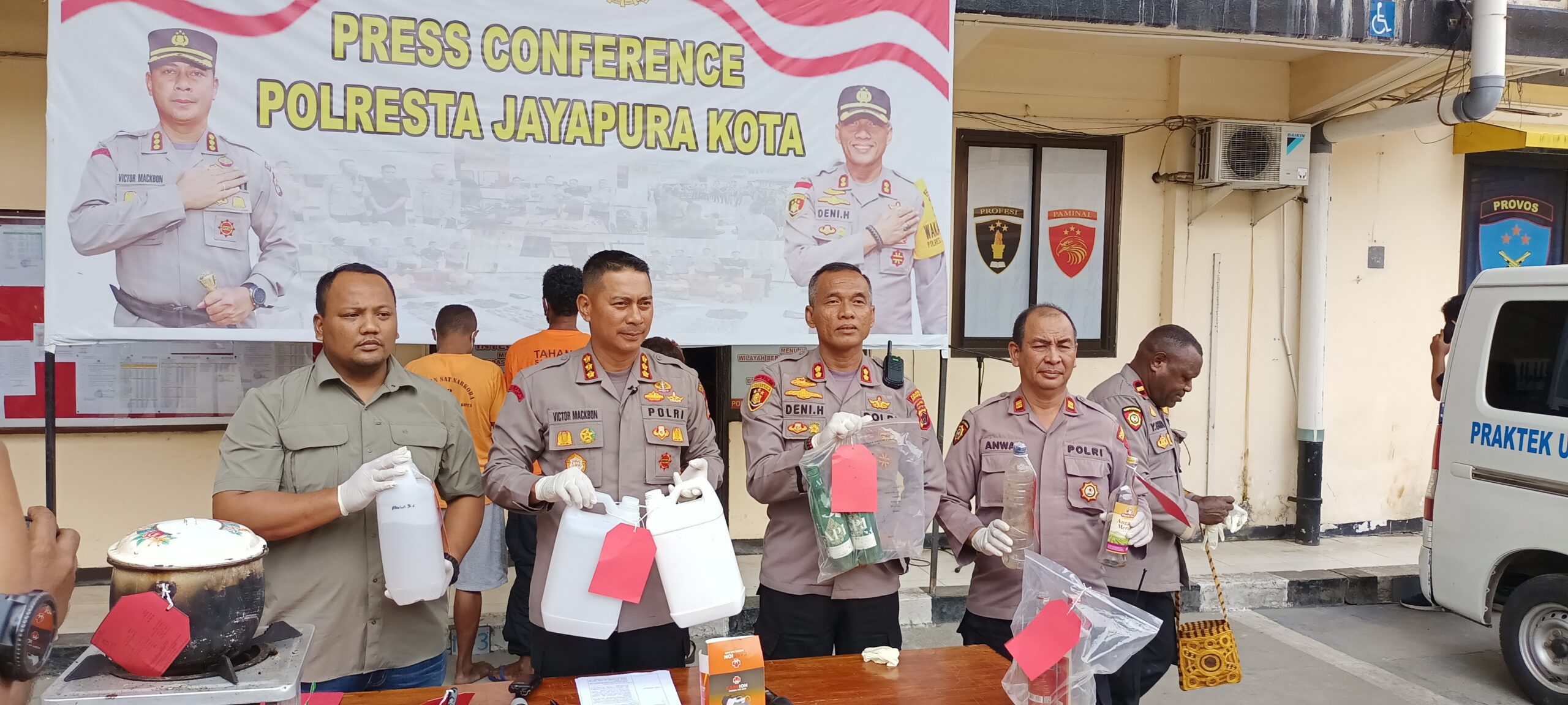Berdasarkan hasil penyidikan terkait kasus tewas 4 orang yang mengkonsumsi minuman keras (Miras) oplosan di Dok IX Distrik Jayapura Utara, Kota Jayapura, kita sudah menetapkan tiga tersangka, yakni FSM laki-laki (31), SR laki-laki (37) dan DCY (30) perempuan, ujar Kapolresta Jayapura Kota, Kombes Victor Dean Mackbon, kepada awak media di Mapolresta, Kamis (7/9/2023).