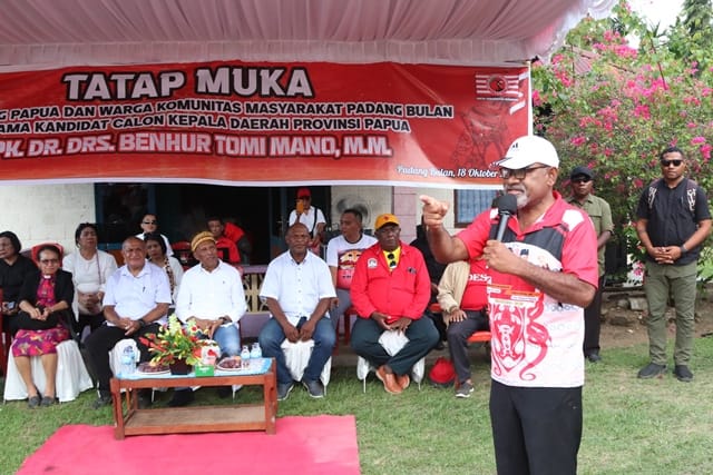 “Kami tidak sembarang bertindak dari satu kandidat ke kandidat yang lain, kami tidak cari makan sana sini, tapi kami harus mencari pemimpin yang bisa berpikir cepat, dan menyelesaikan masalah,” jelasnya saat tatap muka kominitas masyarakat padang bulan dengan calon gubernur Papua, Benhur Tomi Mano, Jumat (18/10/2024).