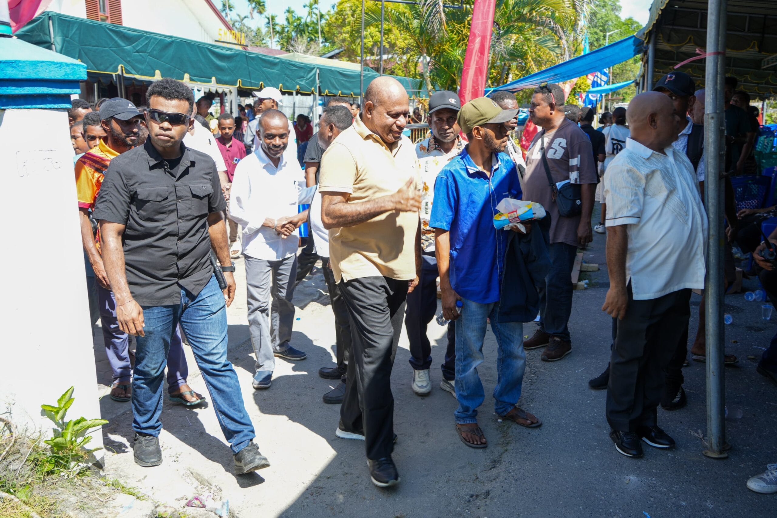Matius Fakhiri – Aryoko Rumaropen pun diarak hingga keluar area pelabuhan sembari berhenti untuk berdialog dengan masyarakat sebelum masuk dalam mobil.