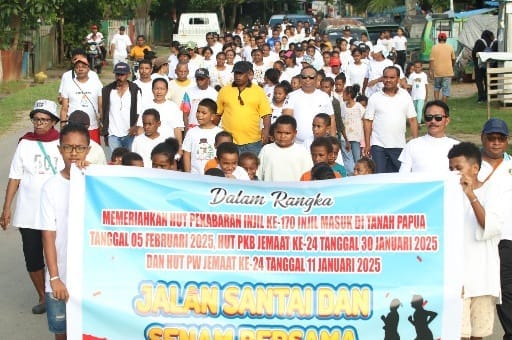 Jayapura, Teraspapua.com – Dalam rangka memperingati Hari Ulang Tahun (HUT) Pekabaran Injil (PI) yang ke- 170 tahun, HUT PKB ke-24 Jemaat Gereja Kristen Injili (GKI) Isaak Samuel Kijne Sborhoinyi pada tanggal 30 Januari 2025 dan HUT PW yang ke-24 tahun pada tanggal 11 Februari 2025, makan panitia hari-hari besar grejawi (PHBG) menggelar jalan santai.