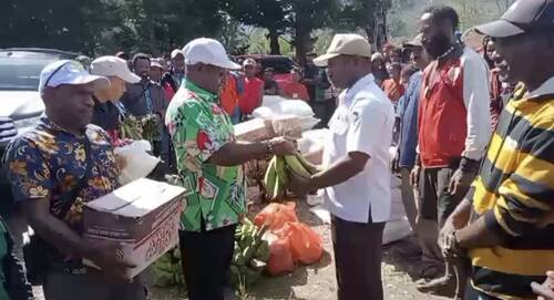 Bantuan tersebut berupa hasil kebun seperti ubi, petatas, kacang, nanas, jagung, pisang, ketimun, sayur-mayur, serta bahan makanan lainnya seperti mie instan dan beras.