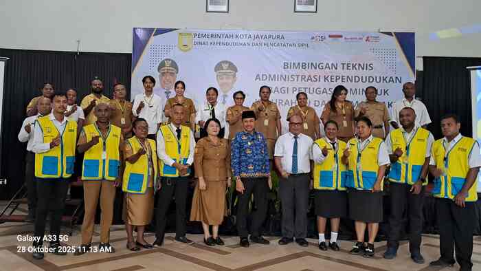 Jayapura, Teraspapua.com – Pemerintah Kota (Pemkot) Jayapura melalui Dinas Kependudukan dan Pencatatan Sipil (Dispendukcapil) menggelar Bimbingan Teknis (Bimtek) Administrasi Kependudukan (Adminduk) bagi petugas Adminduk di kelurahan dan rumah sakit se-Kota Jayapura. Kegiatan ini berlangsung di Hotel Sip Azana, Kota Jayapura, Selasa (28/10/2025).