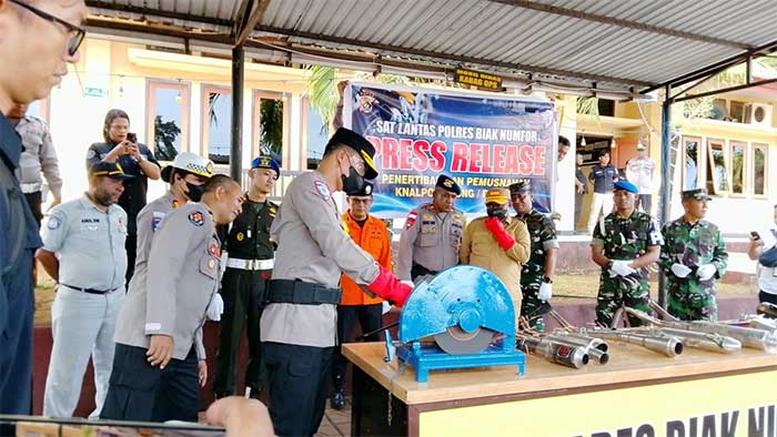 Kegiatan tersebut dipimpin langsung oleh Kapolres Biak Numfor AKBP Ari Trestiawan bersama jajaran Satuan Lalu Lintas (Satlantas) Polres Biak Numfor. Pemusnahan knalpot brong ini juga disampaikan kepada publik melalui kegiatan press release sebagai bentuk transparansi penegakan hukum kepada masyarakat.